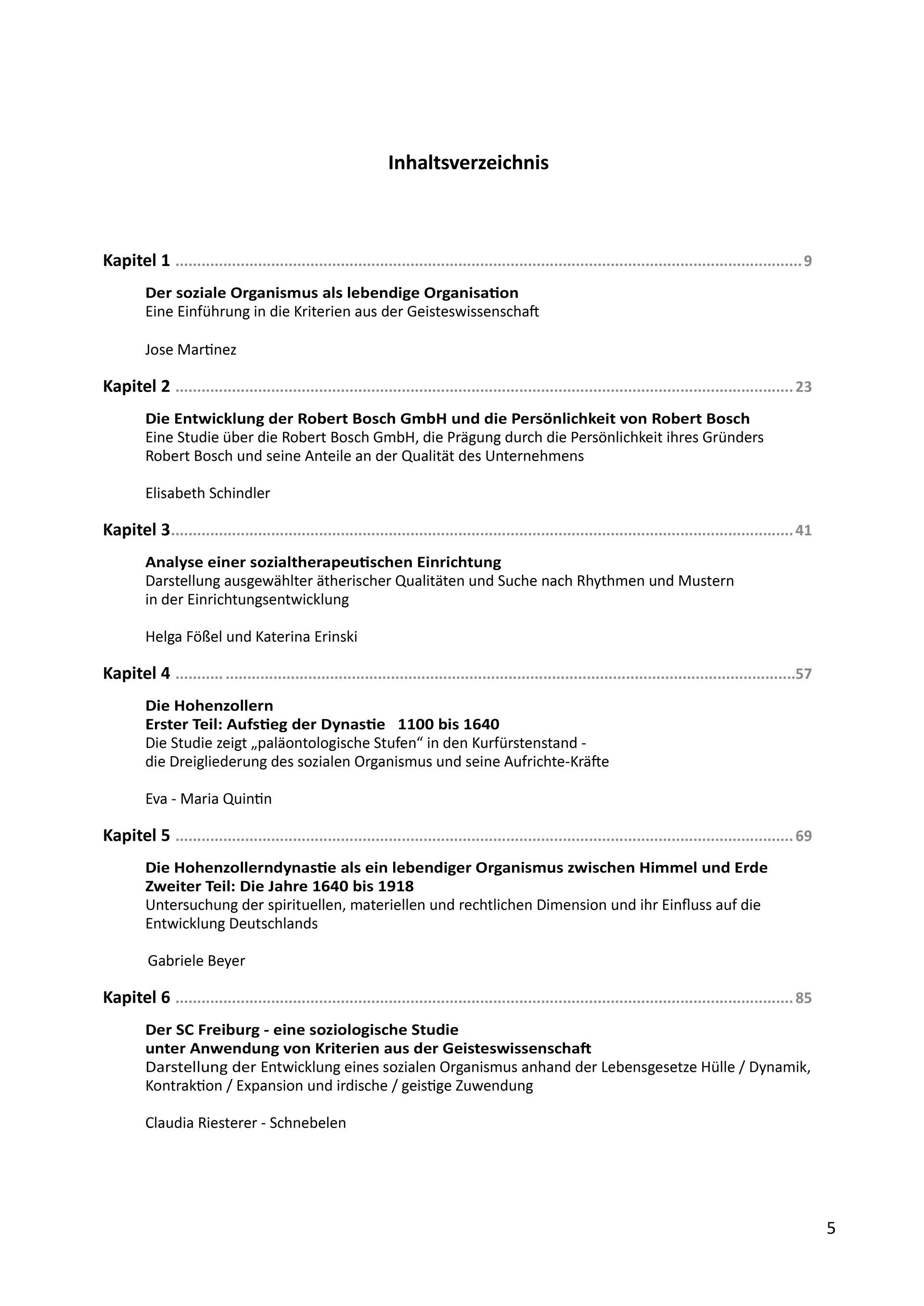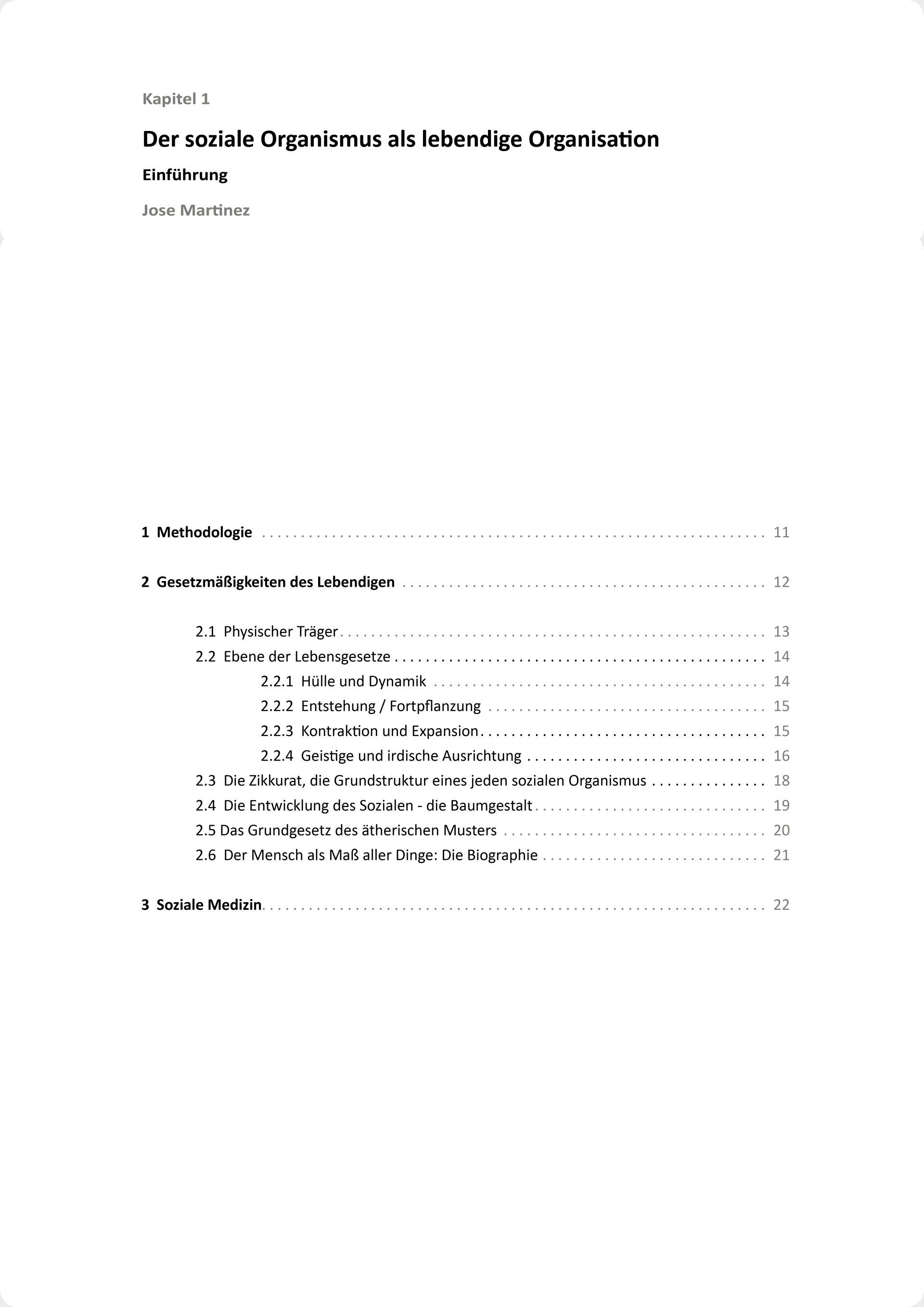 In den Studien "Der soziale Organismus als lebendige Organisation" der 10 Autoren werden Gesetzmässigkeiten des Lebendigen auf konkrete soziale Organismen (einschliesslich Biografien und Dynastien) angewendet, um zu einer realen Diagnose ihrer Strukturen zu gelangen. Diese Methode gründet auf der Anthroposophie und wurde von Jose Martinez dahingehend weiterentwickelt, dass sie das Potential einer sozialen Medizin in sich trägt.